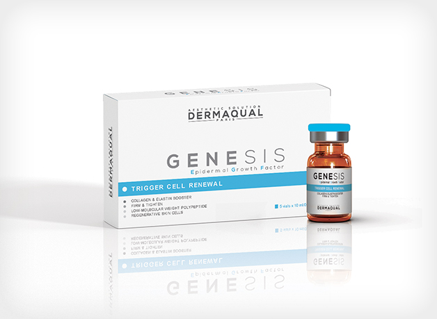 E.G.F. to czynniki wzrostu naskórka promujące i wzmacniające regenerację tkanek skóry. Te naturalne białka działają jako przekaźniki, stymulują podziały i naprawę różnych typów komórek. E.G.F. są podstawowym inicjatorem syntezy kolagenu i elastyny na poziomie komórkowym oraz głównym składnikiem popularnej terapii osoczem bogatopłytkowym. Obecnie jest to najsilniejszy znany czynnik do wywoływania procesów fibroblastycznych i aktywowania komórek macierzystych skóry. Formuła E.G.F. Genesis zawiera dodatkowo kwas hialuronowy poprawiający nawilżenie i objętość oraz kwas ferulowy, znany ze swojego spektakularnego działania antyoksydacyjnego i depigmentującego.